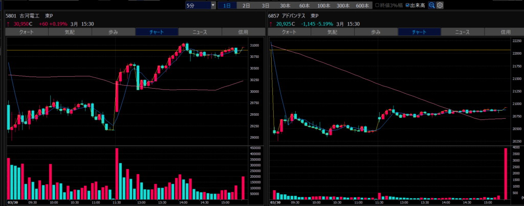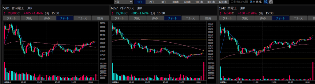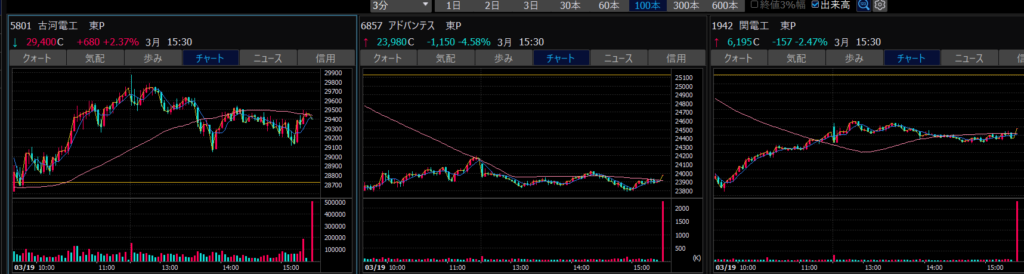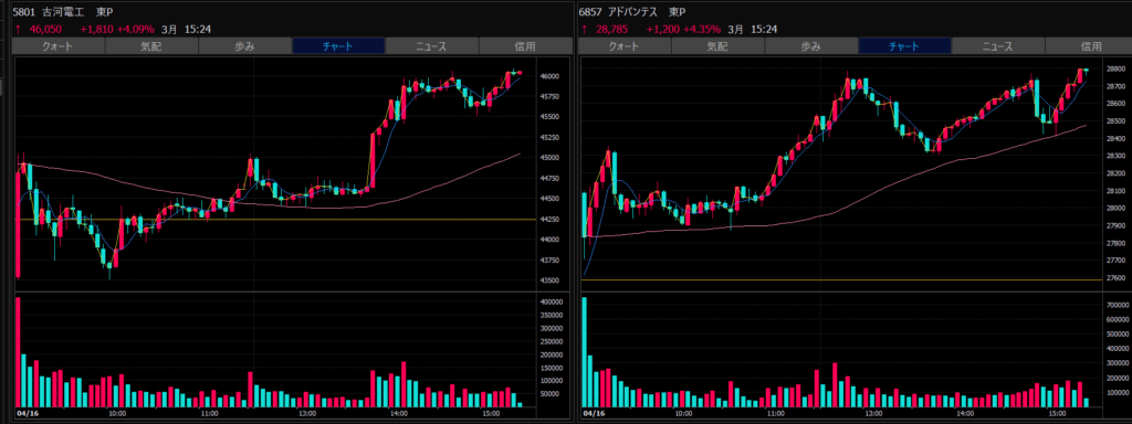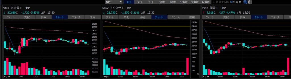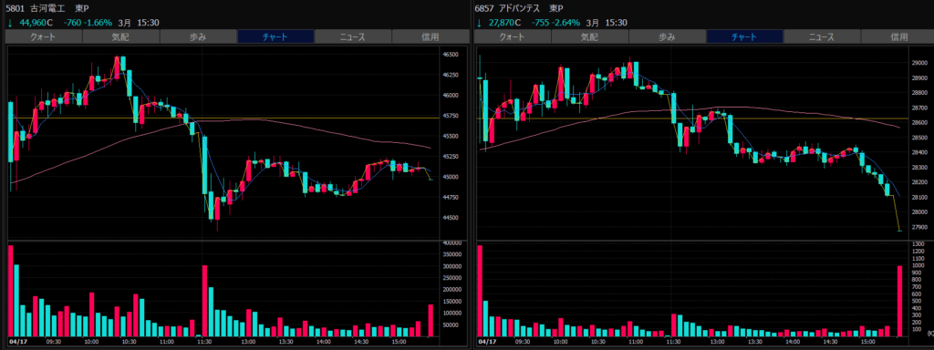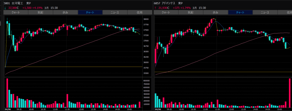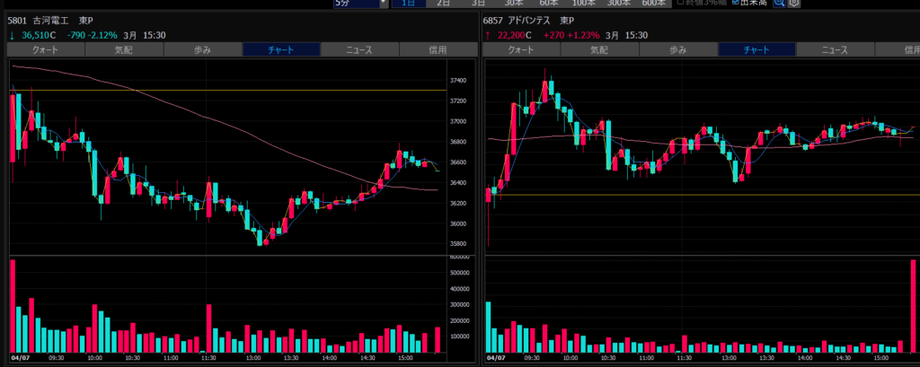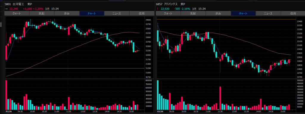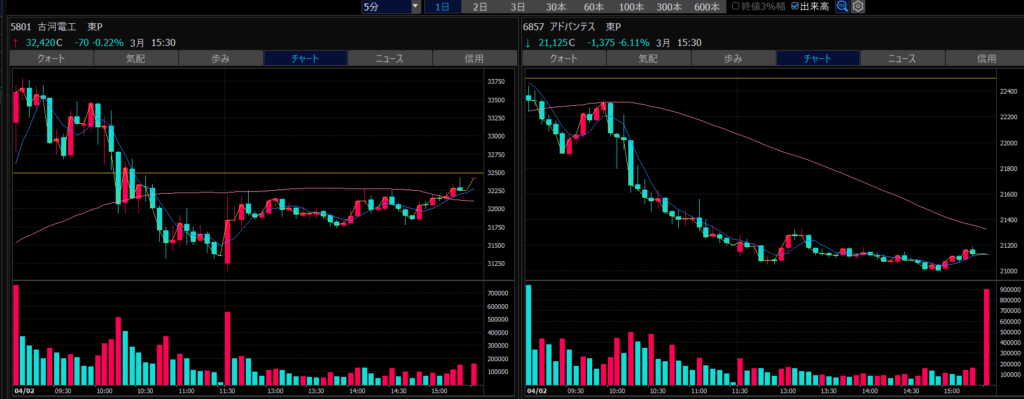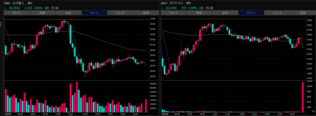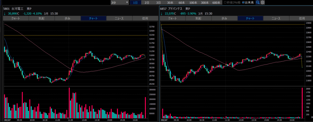 - エントリーしたらカンザシを渡るのを待とう。耐えるってこと。今日だけで一体いくら取り損ねたか。古河電気工業、アドバンテスト。やれやれ。
