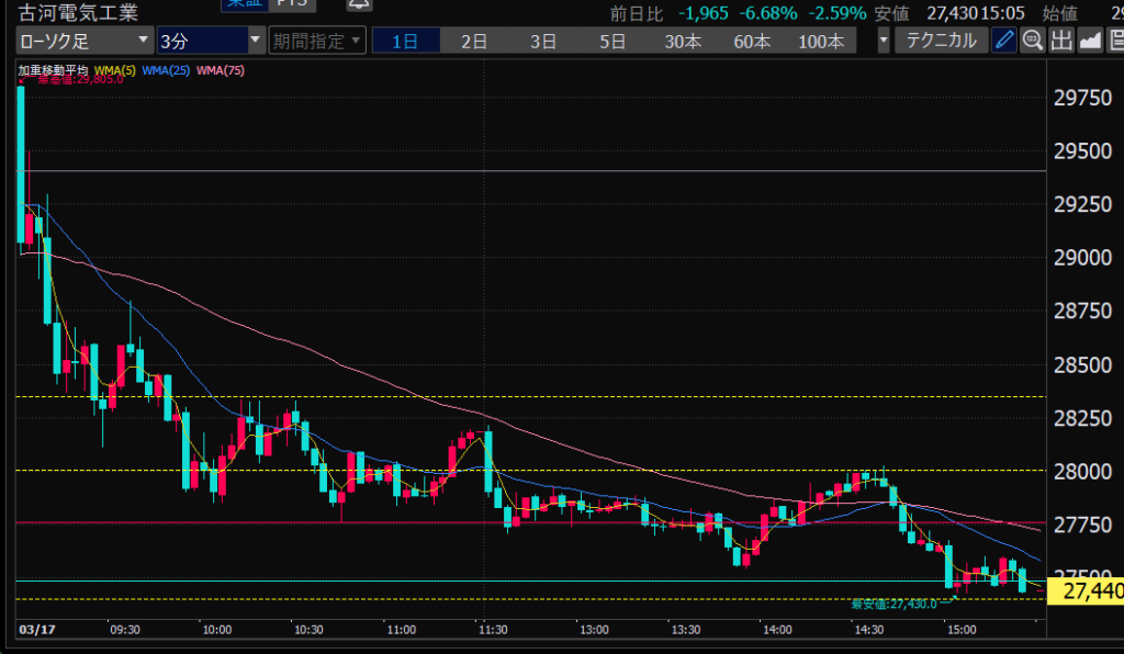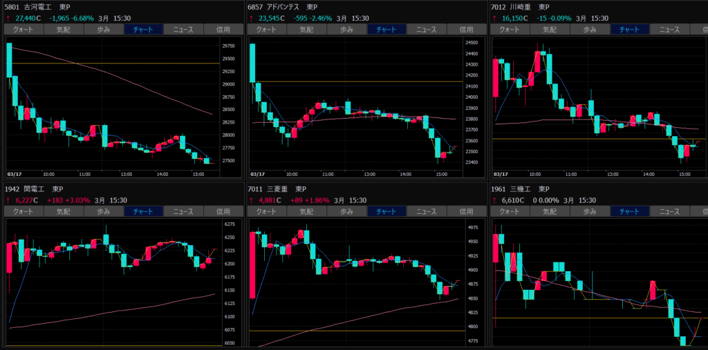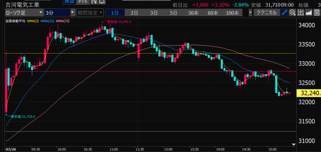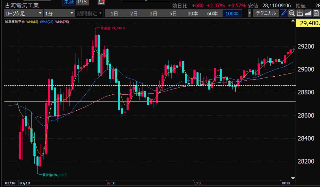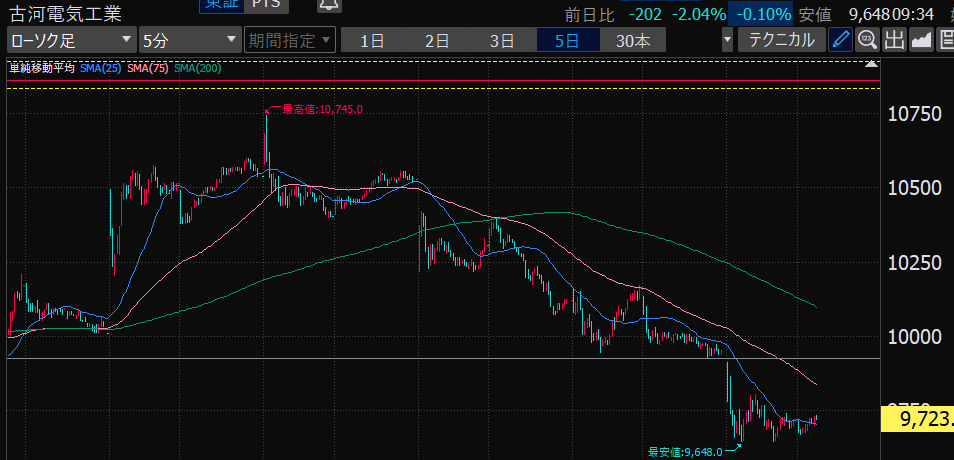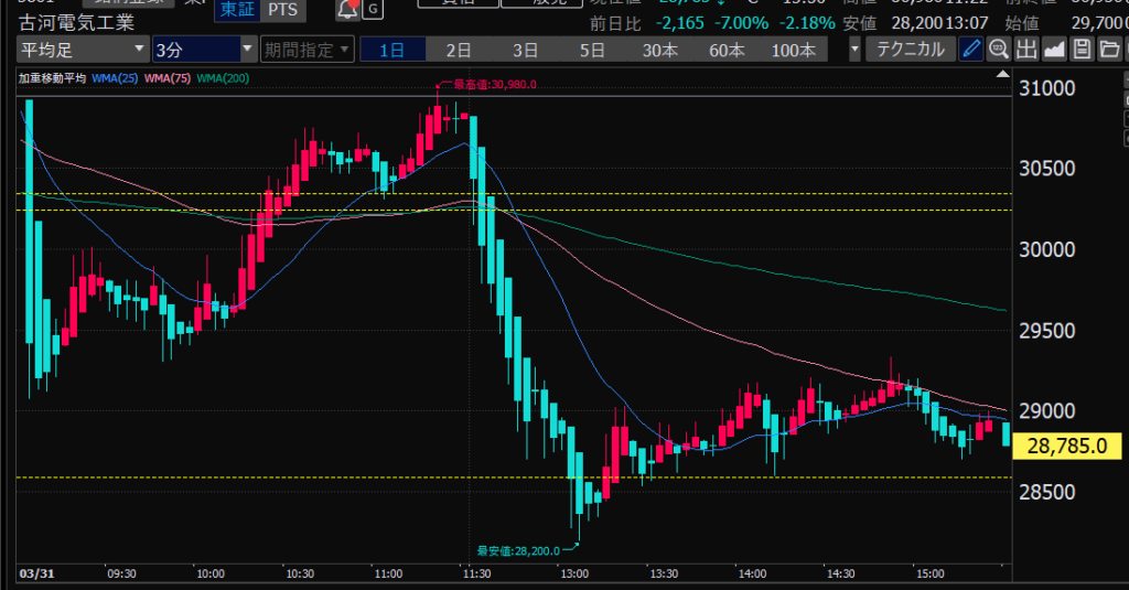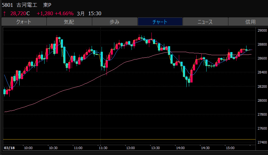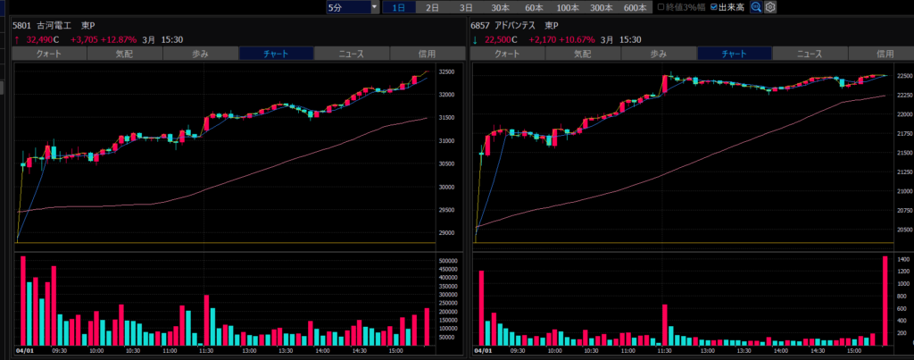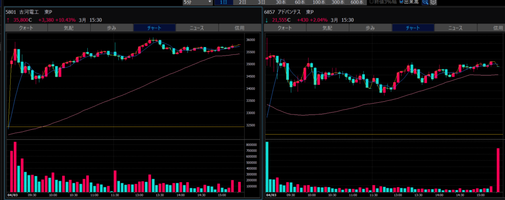 - エントリーしたらカンザシを渡るのを待とう。耐えるってこと。今日だけで一体いくら取り損ねたか。古河電気工業、アドバンテスト。やれやれ。