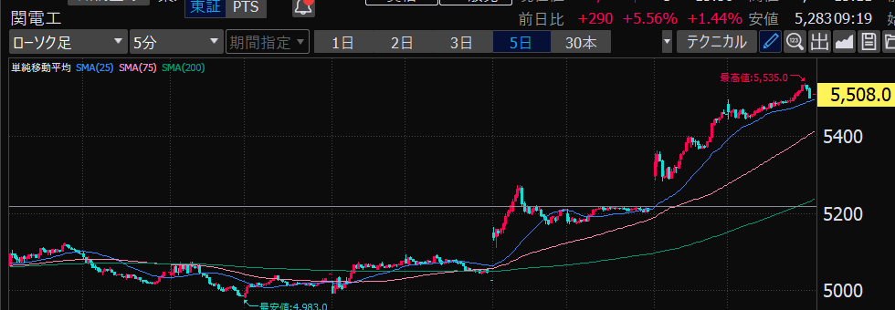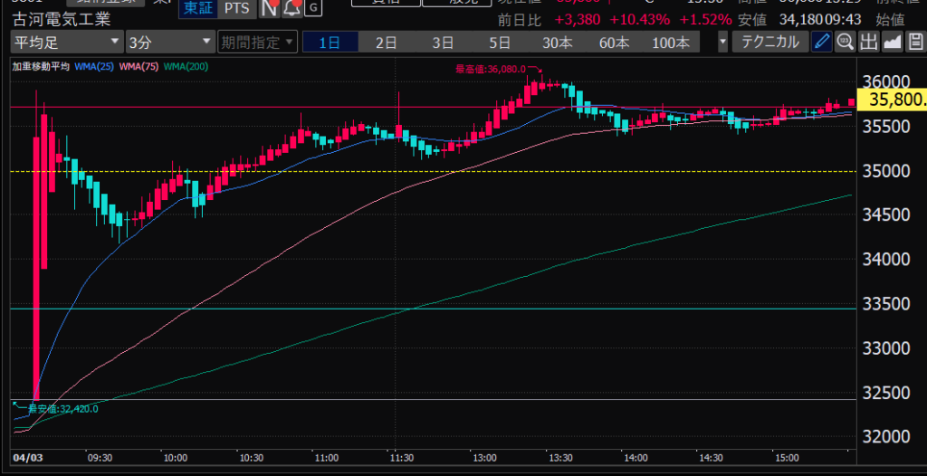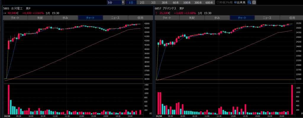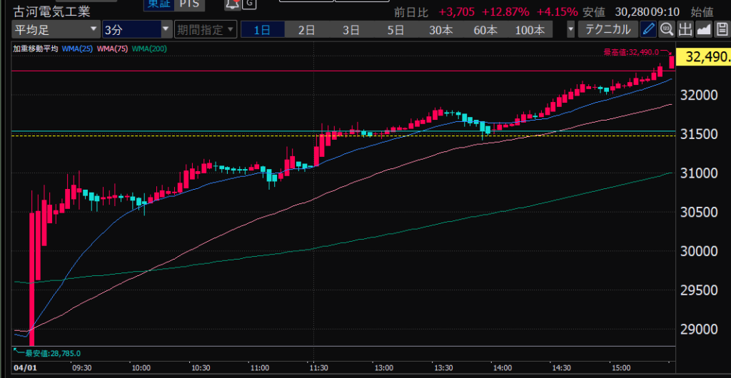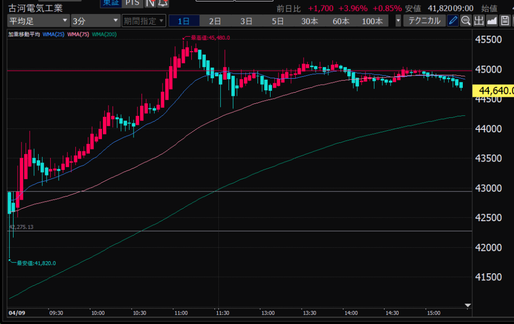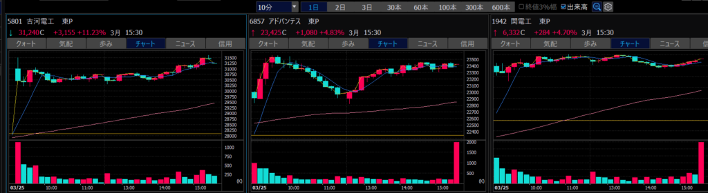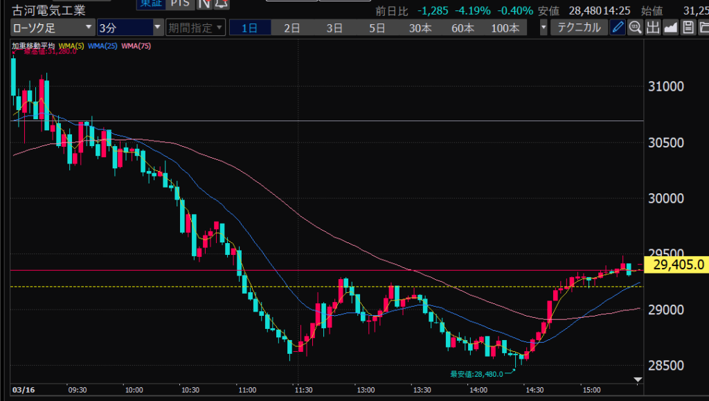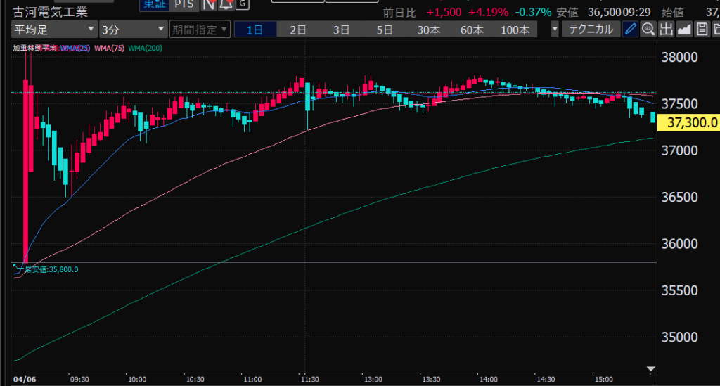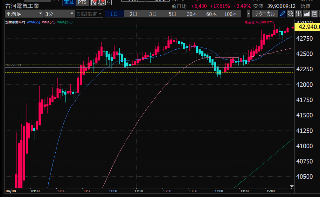 - エントリーしたらカンザシを渡るのを待とう。耐えるってこと。今日だけで一体いくら取り損ねたか。古河電気工業、アドバンテスト。やれやれ。