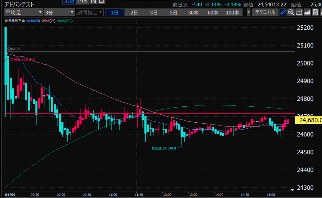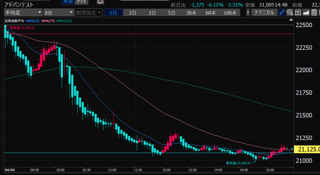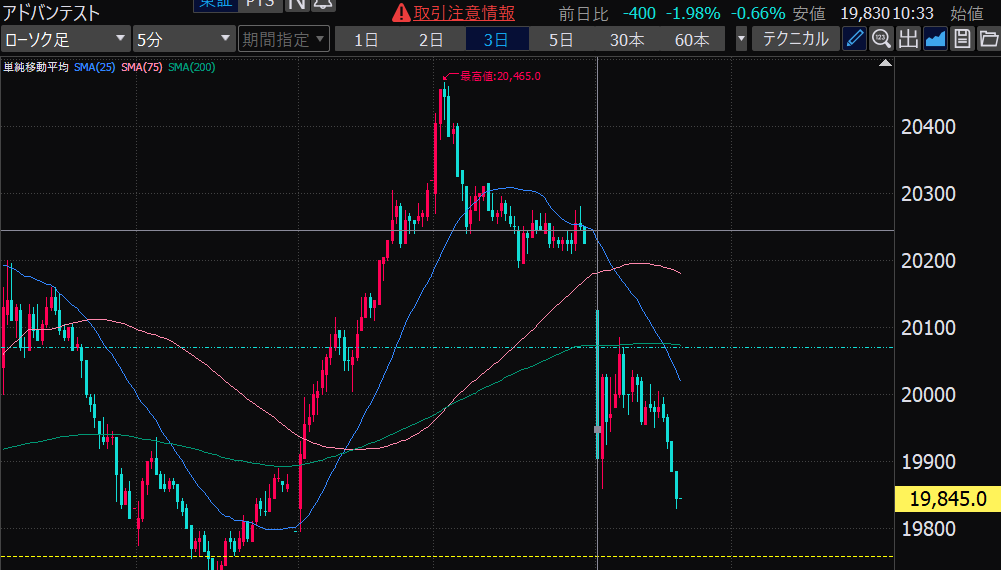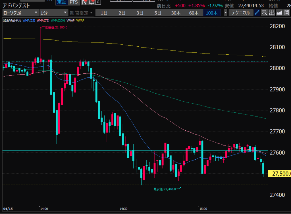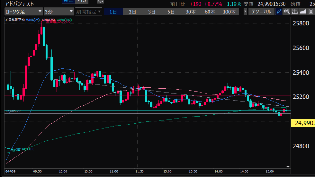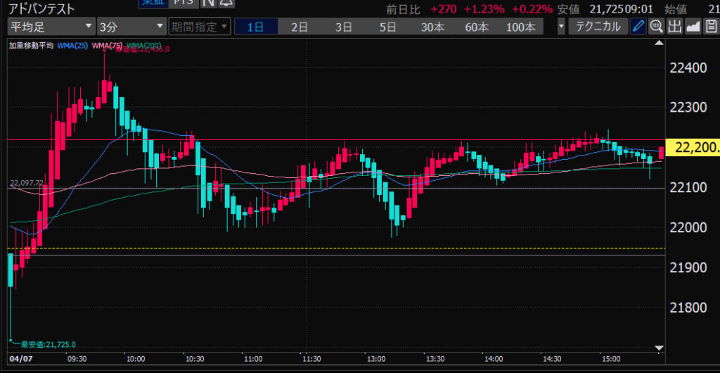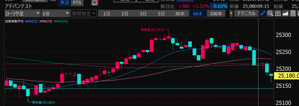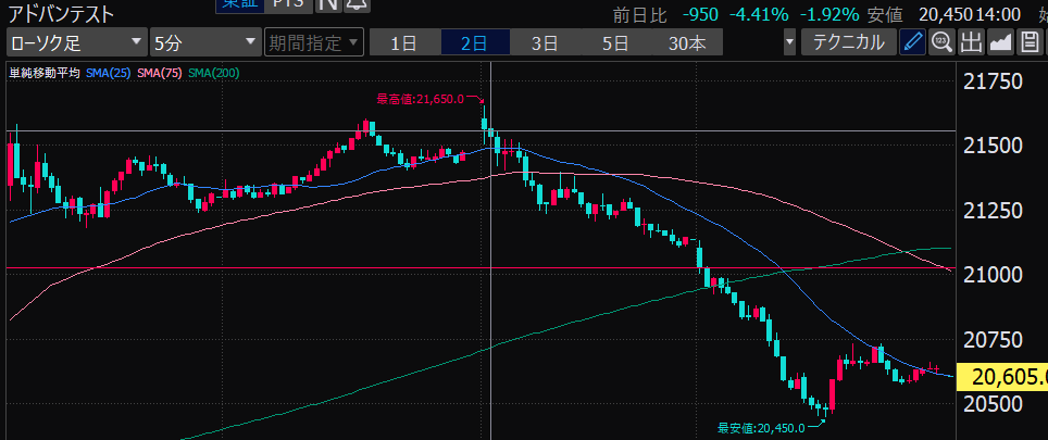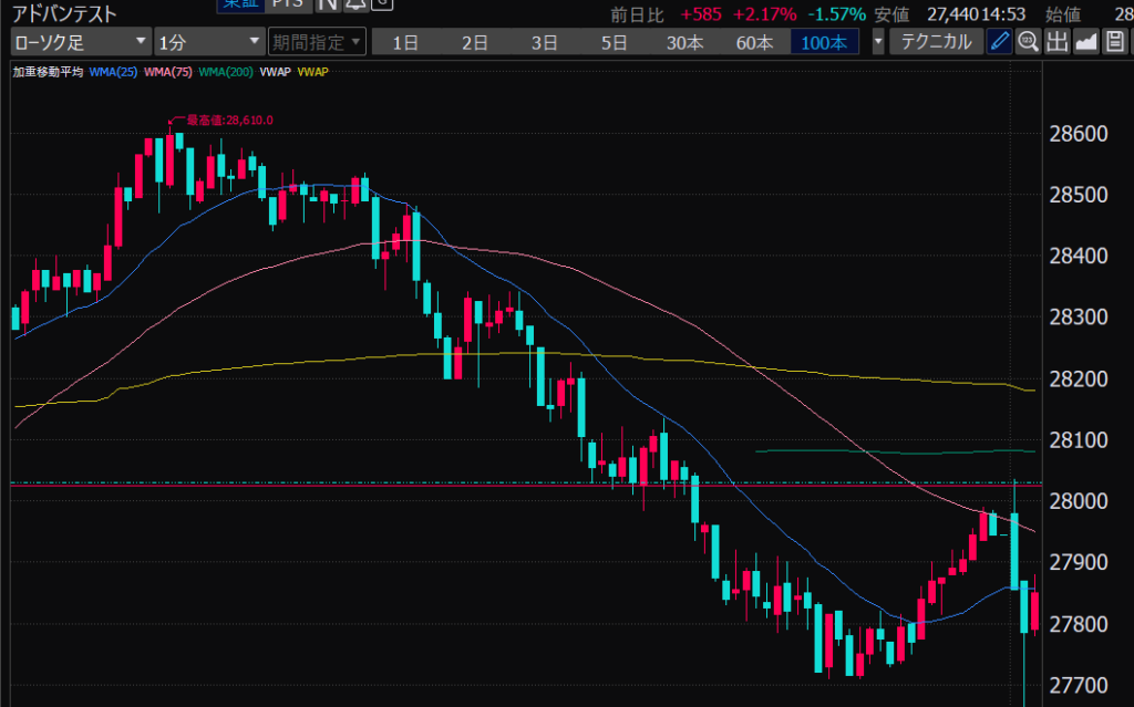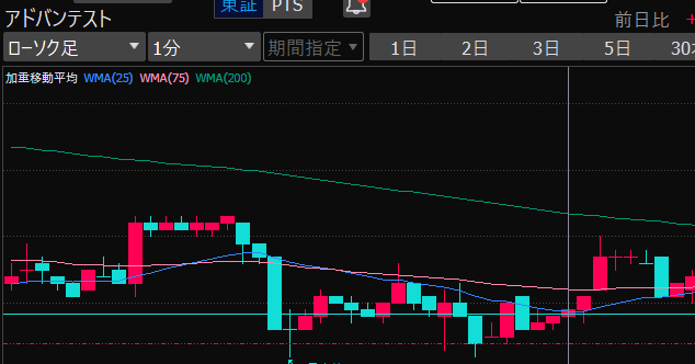 - アドバンテスト、下がるか上がるかはっきりして。イラつく。