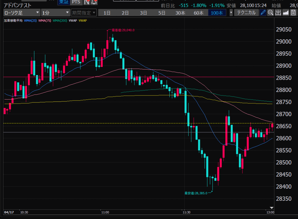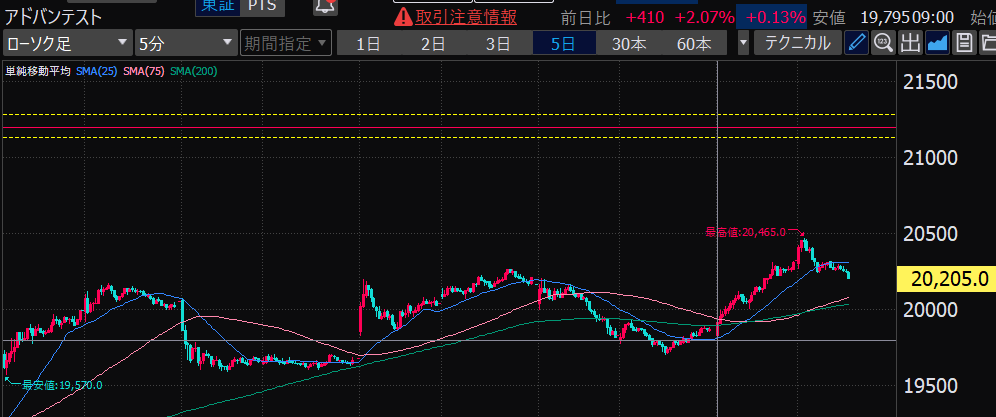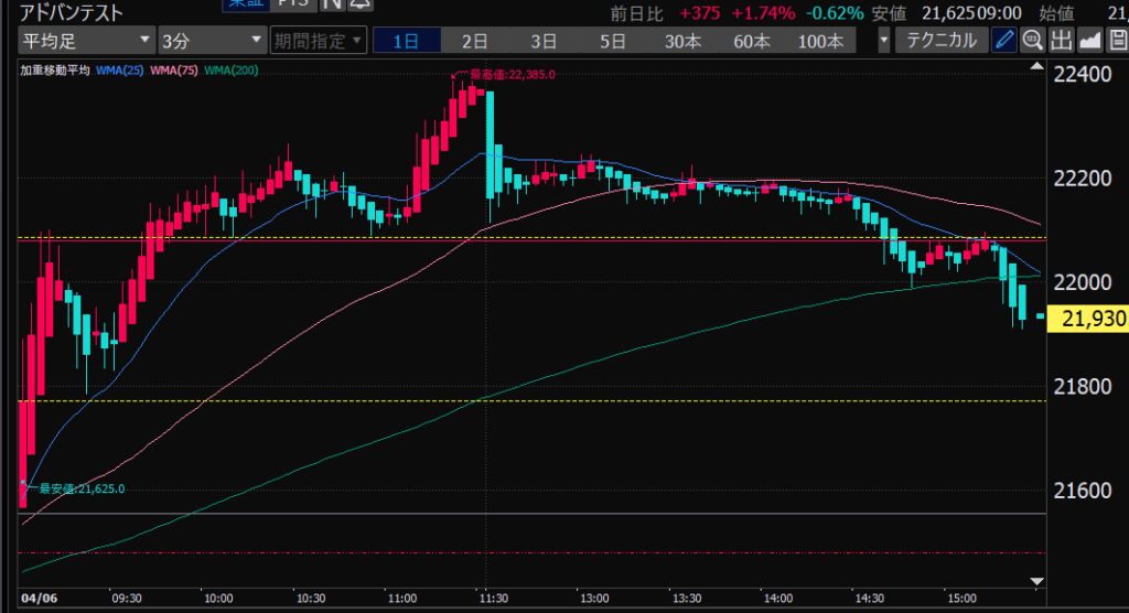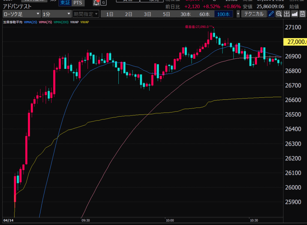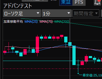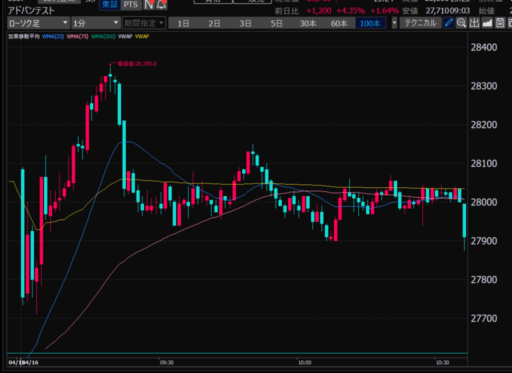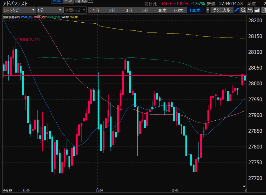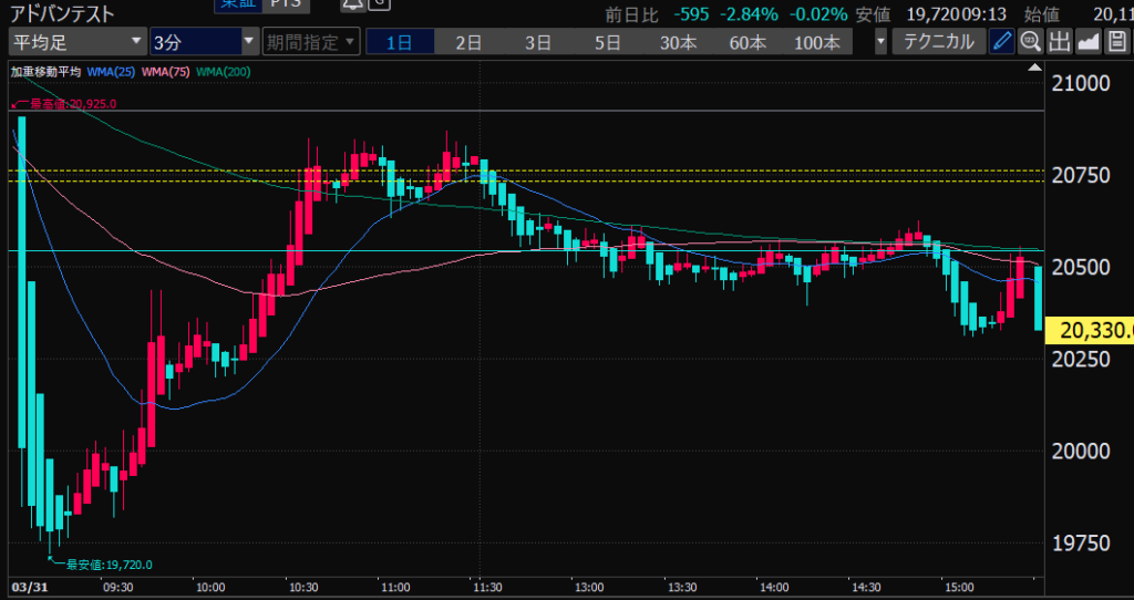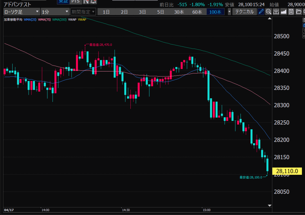 - アドバンテスト、下がるか上がるかはっきりして。イラつく。