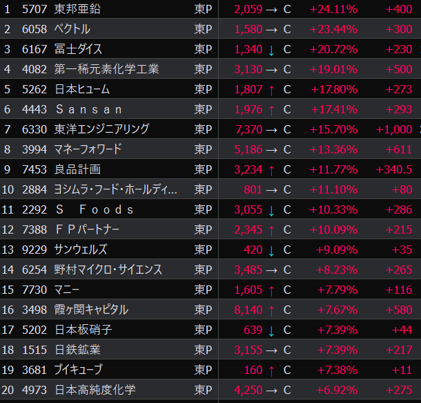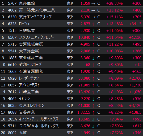 - SHIFTも消去したことだし、上昇ムードの銘柄を新規参入してもよいかも。レアアース関連、下水インフラ関連とか、手を付けていない領域が気になる。