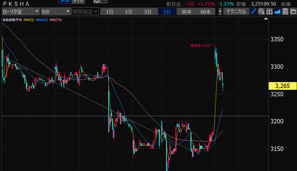 - 後場にはいって突然の急騰。なんなの、対応しきれない。こういう時こそPBが生きるのに、ちょっとした下落でトレンド反転を予想して損切りして、再度上昇されて、の繰り返し。急な値動きのときほど動かないのが大切か。