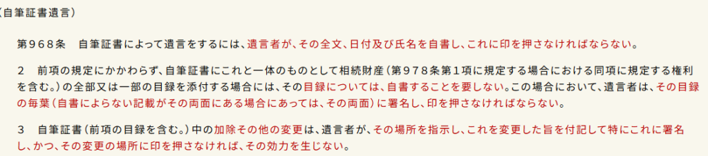 • 自筆証書遺言は、内容や日付、署名が遺言者の自筆である必要があります。